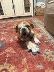 Oscar is a sweet boy that is ready for all the love, and would love to be your shadow. He has a bit more energy than the typical bulldog, but that makes him more endearing. He gets along with other dogs, (although he does have a little dominance in him), and he loves to play with stuffies. Unsure, if he gets along with cats, but he did adjust to his foster mom’s backyard land tortoise. Oscar does well in a crate, loves car rides, but doesn’t really have many basic commands yet, (we’ll continue to work on it). He is for the most part potty trained, but will have an accident at night if left out of crate. Oh, and if you haven’t noticed, he is a one eyed wonder, but he seemed to adjust really well to it, and is a handsome as they come.